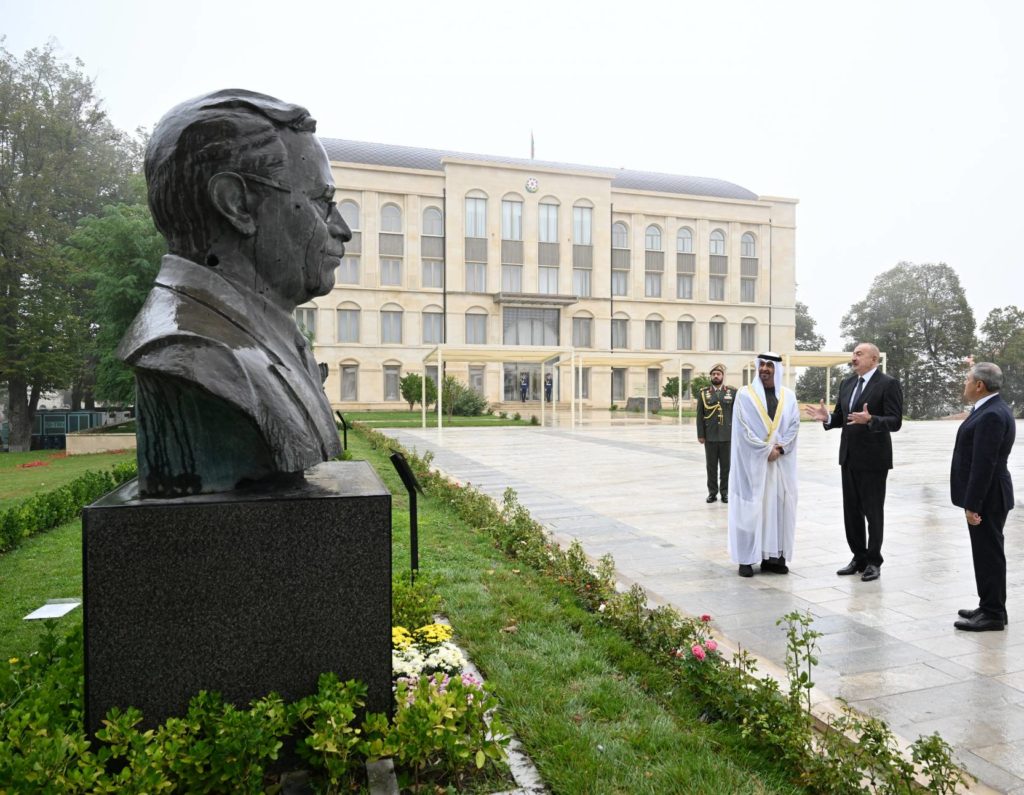 Azərbaycan və Birləşmiş Ərəb Əmirliklərinin prezidentləri Şuşada Azərbaycanın tanınmış şəxsiyyətlərinin güllələnmiş heykəllərinə baxıblar