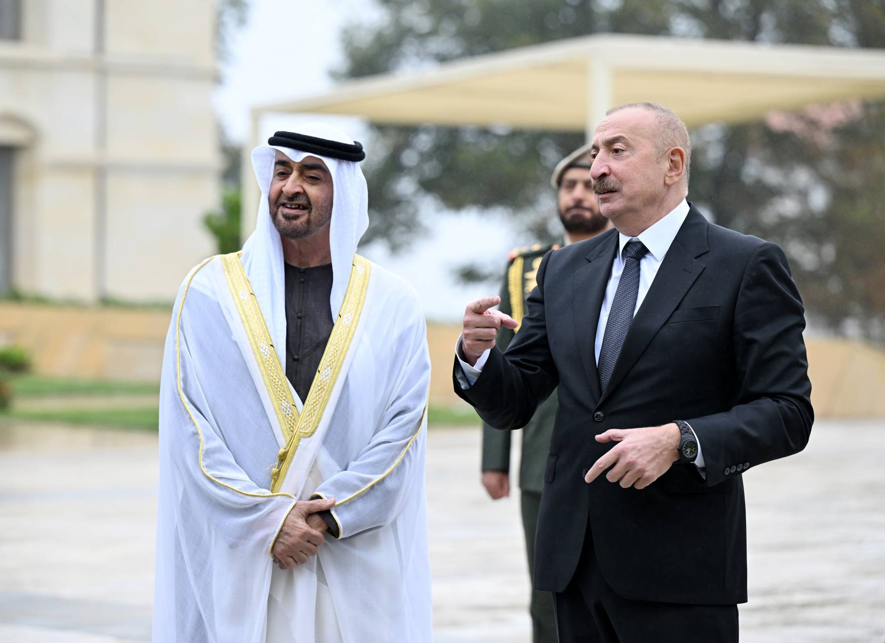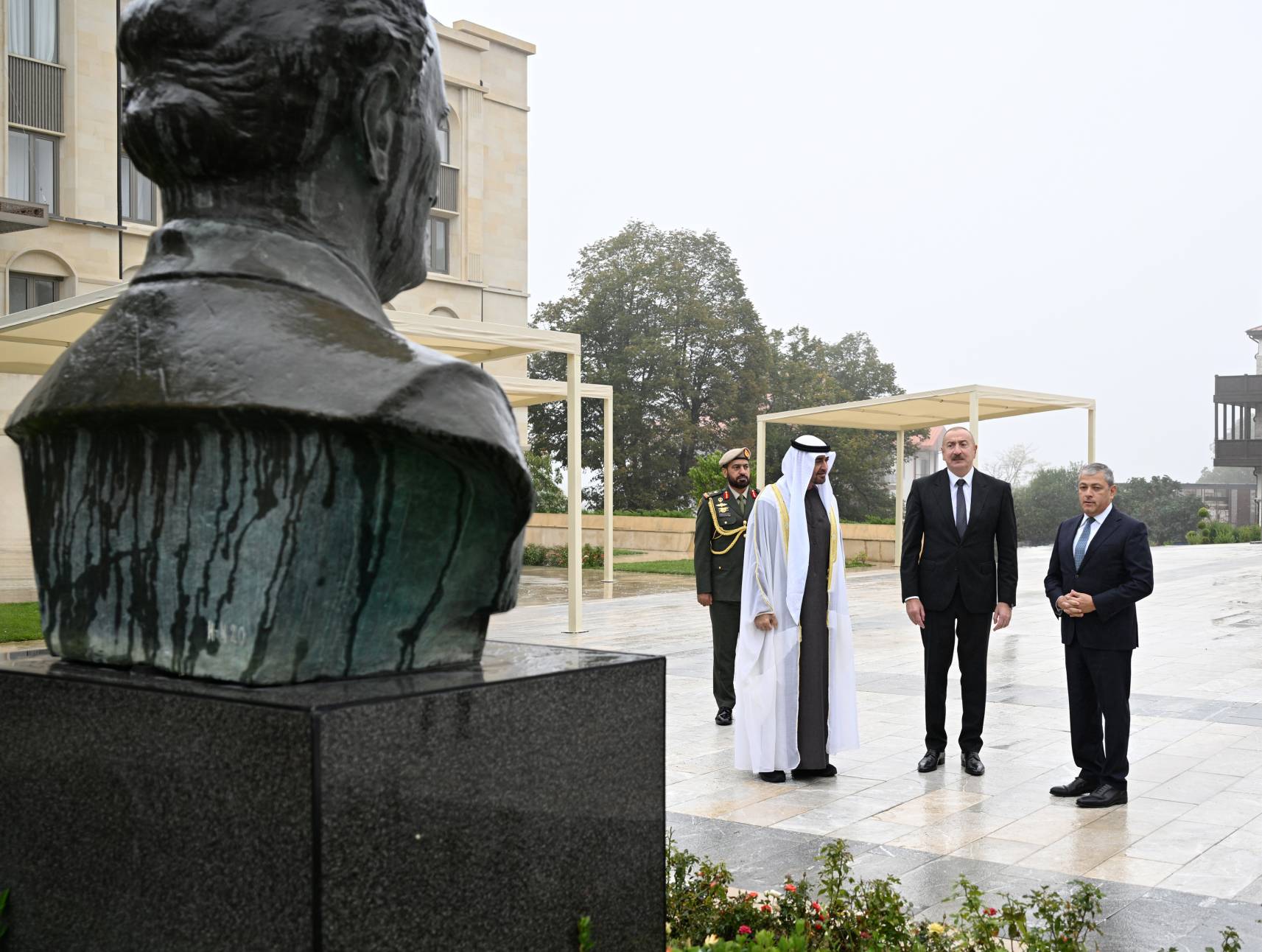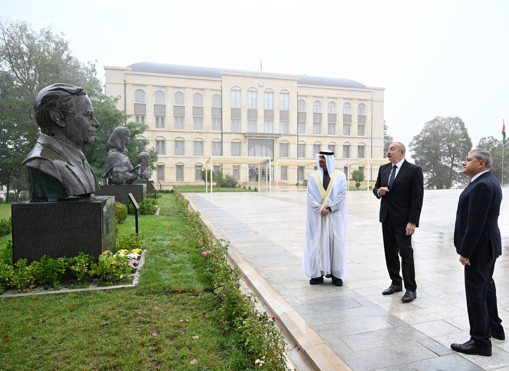 Azərbaycan və Birləşmiş Ərəb Əmirliklərinin prezidentləri Şuşada Azərbaycanın tanınmış şəxsiyyətlərinin güllələnmiş heykəllərinə baxıblar