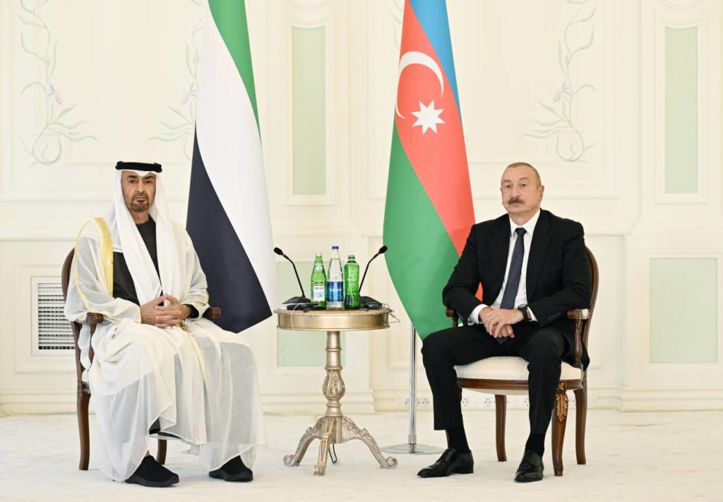 Bizim siyasi əlaqələrimiz çox uğurla inkişaf edir. Biz hər zaman beynəlxalq təşkilatlarda bir-birimizin yanındayıq, bir-birimizi dəstəkləyirik. Son vaxtlar qarşılıqlı sərmayə qoyuluşu bizi çox şad edir. Neft-qaz sahəsində əməkdaşlıq dərinləşir. Bu gün imzalanmış sənədlər arasında nəqliyyat sektorundakı əməkdaşlıq böyük perspektivə malikdir. Biz xüsusilə ölkənizə və ölkənizin şirkətlərinə minnətdarıq ki, Azərbaycanın bərpaolunan enerji növlərinin işlənilməsi istiqamətində bizə çox böyük dəstək vermişlər. Birləşmiş Ərəb Əmirliklərinin şirkətləri burada bizim strateji tərəfdaşlarımızdır, əsas investordur və Azərbaycanda istifadəyə verilmiş birinci Günəş Elektrik Stansiyasının tikintisi və investisiyaları ölkənizin bizə dəstəyi nəticəsində mümkün olmuşdur. Bilirsiniz ki, planlarımız daha genişdir, bir neçə giqavat bərpaolunan enerji növünün yaxın gələcəkdə Azərbaycanda istehsalı məhz Sizin şəxsi göstərişinizin və ölkənizin şirkətlərinin fəaliyyəti nəticəsində mümkün olacaqdır.